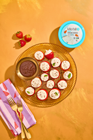 - DECORATE the strawberries by adding approximately 2-3 tsp of the cream cheese filling into the hole in the top of each strawberry. Either use a piping bag fitted with a nozzle of your choice or a teaspoon, to evenly fill each strawberry with the mixture.