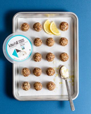 - Add the lemon zest and small dollops of the cream cheese. Process for another few seconds. Carefully scrape the bowl and process again until fully combined. The mixture should stick together well and easily hold a ball shape.